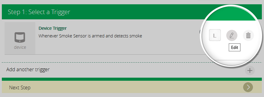 - Click the editing pen icon next to the scene "Smoke Detection," and then click on the edit icon next to "Step 1: Select a Trigger".