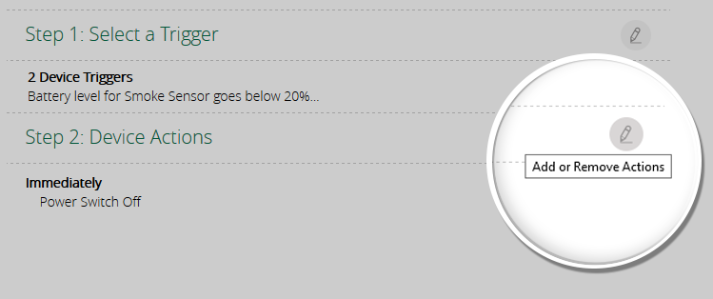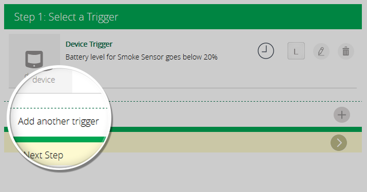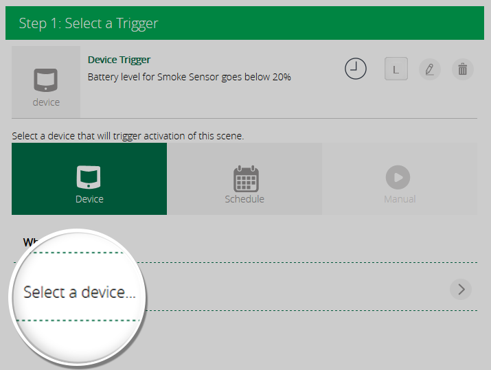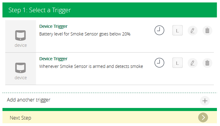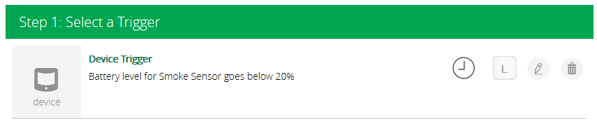 Suppose you wish to change the device trigger event "Whenever Smoke Sensor is armed and detects smoke" to "Battery level goes below."