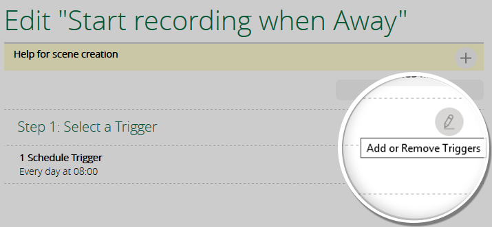 - Click the editing pen next to the scene "Start recording when away" in the overview page, and then click the edit icon next to "Step 1: Select a Trigger"
