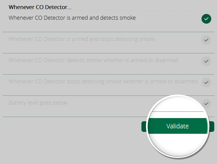 5. Check of the event "Whenever CO Detector is armed and detects smoke" and press "Validate"